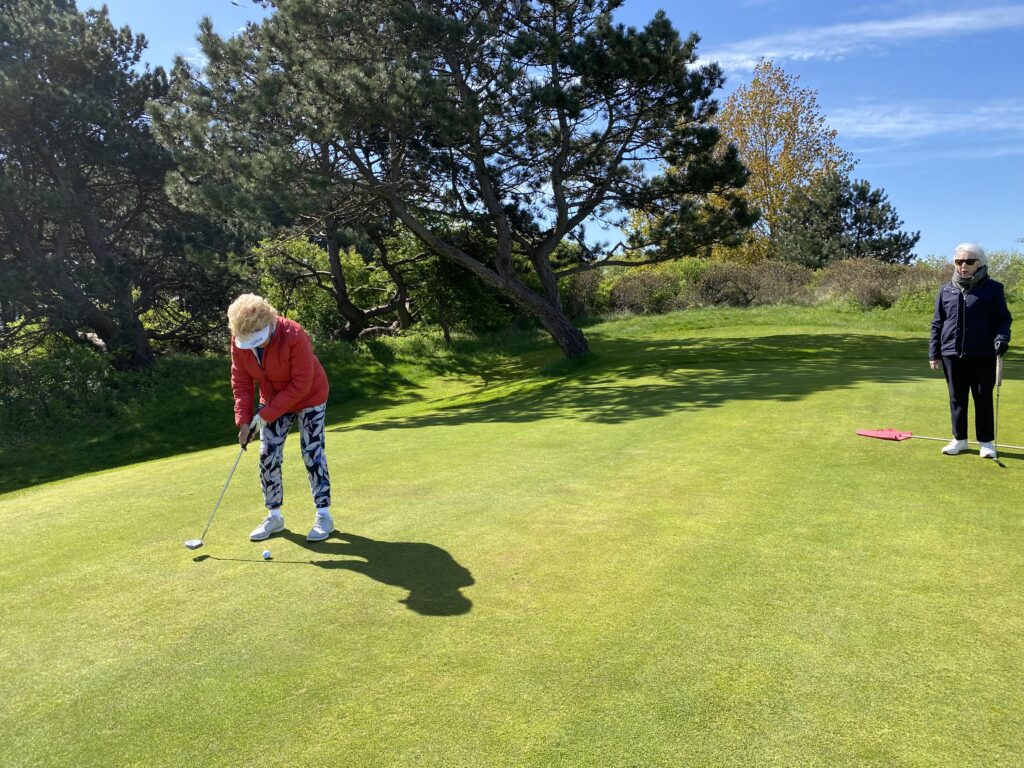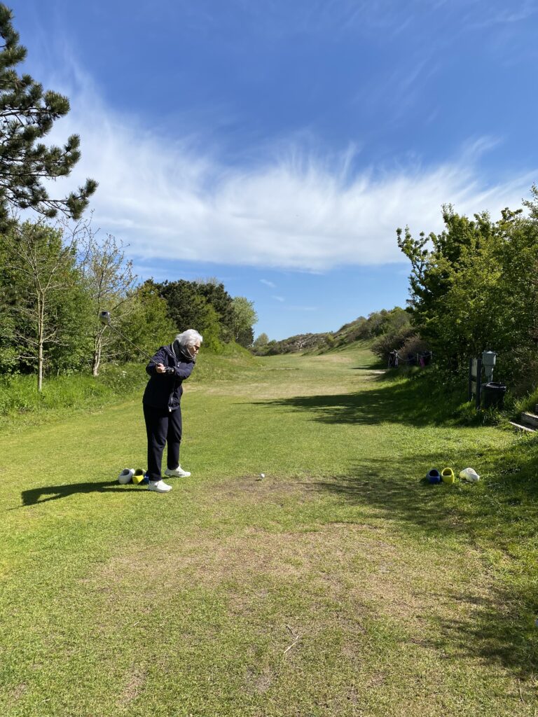 Marina voorzichtig aan het golfen, na haar onfortuinlijke val!
